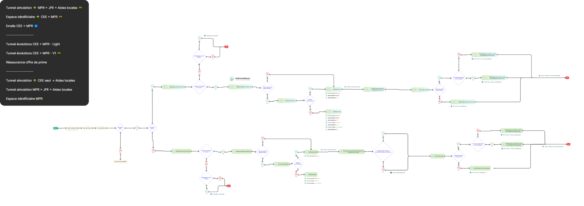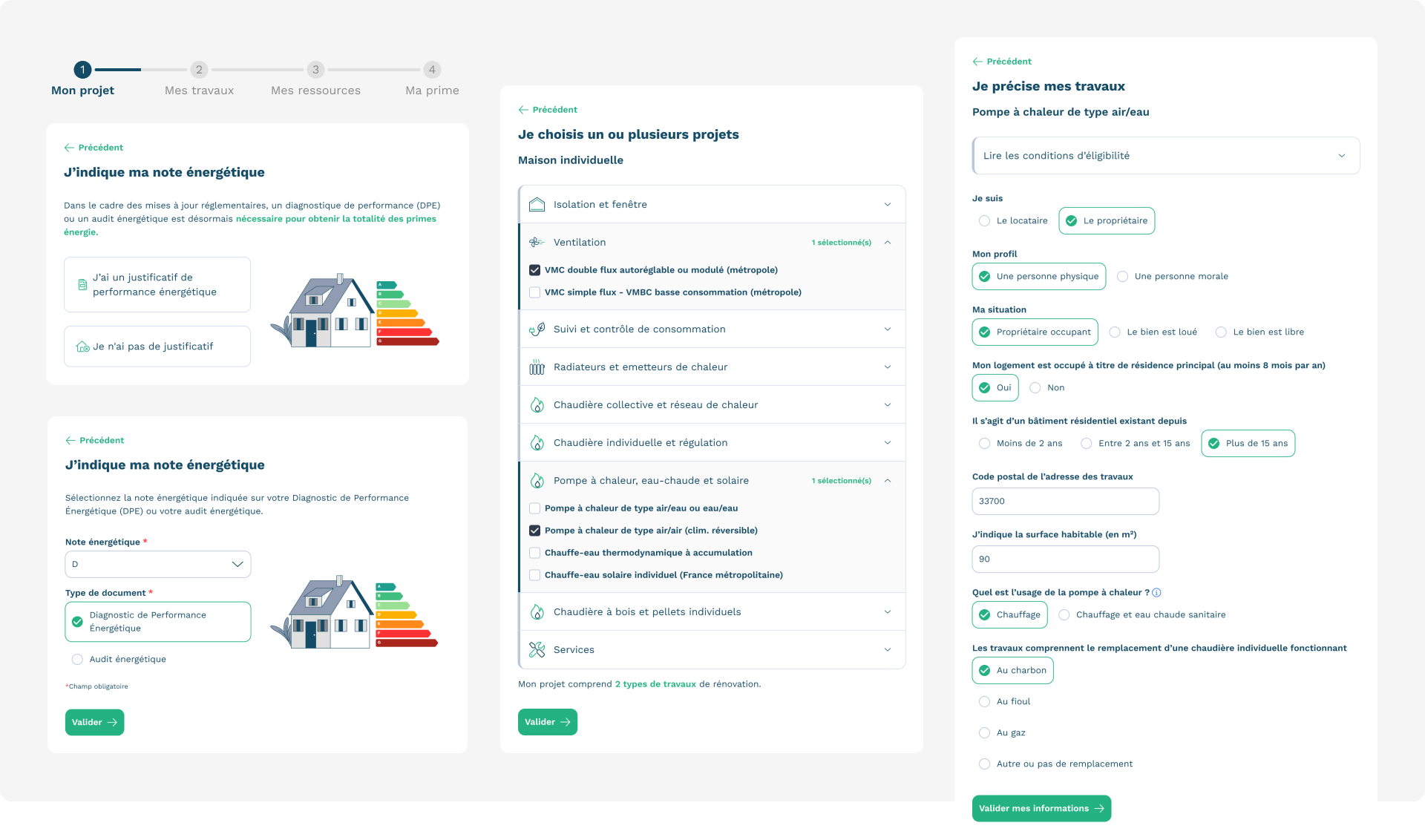– Choix du logement – Note énergétique (étape facultative) – Informations logement – Travaux choisis – Éligibilité (étape facultative) – Résultats de prime (choix des travaux modifiables et éligibilité) – Identification du client – Adresse des travaux – Confirmation de la demande de prime – Confirmation de l’éligibilité (si déclarée) – Ajout du justificatif de performance énergétique
