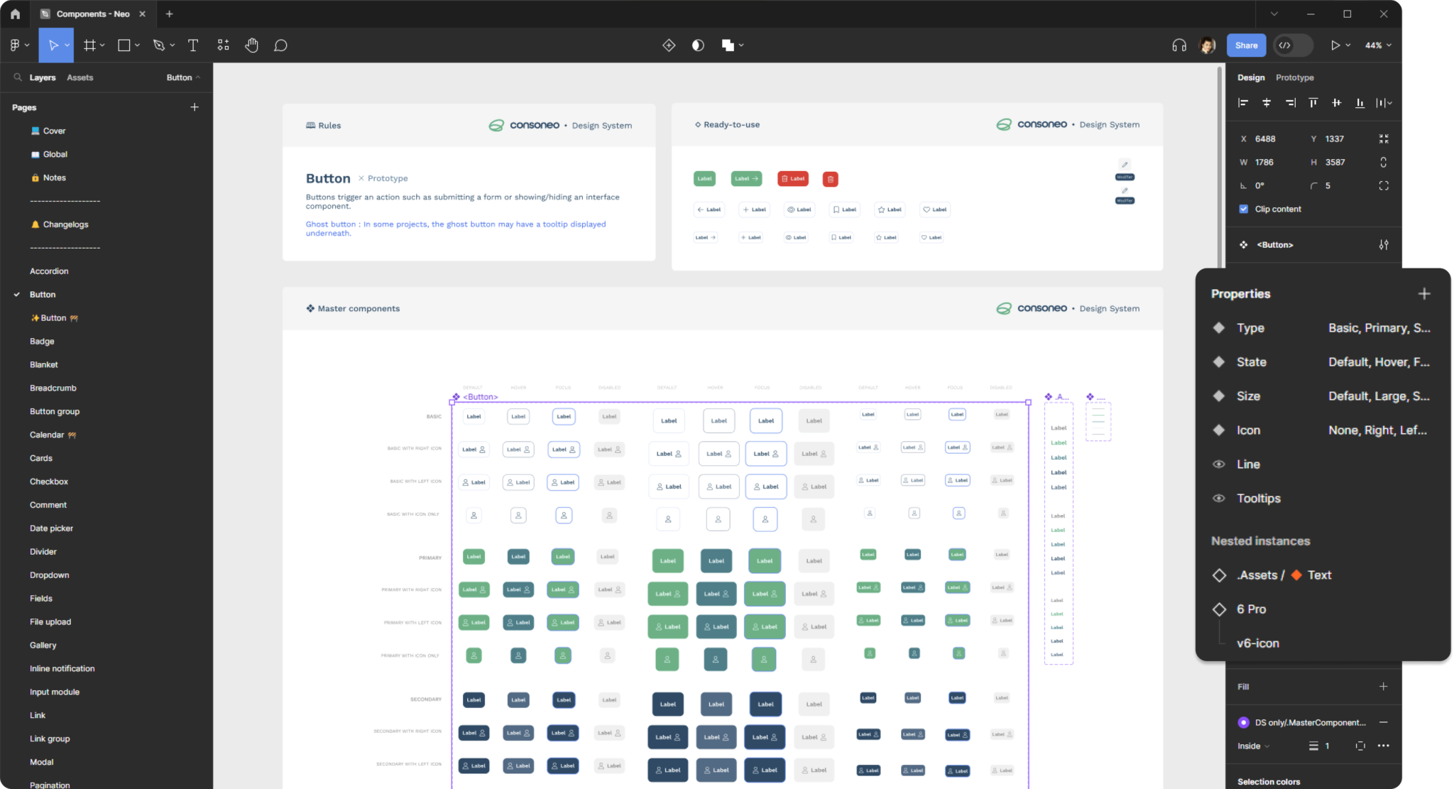 1. Afin de clarifier le contexte d’utilisation des composants et de rendre leur lecture plus agréable. Ce template comprend : un encart dédié aux règles générales à suivre pour maintenir le DS de manière cohérente, un encart pour les composants “master” et leurs composants enfants (souvent non publiés), un encart pour contextualiser les composants et les prototyper, un encart pour les composants prêts à être utilisés et un encart pour les cas particuliers concernant les composants utilisant des variables spécifiques.