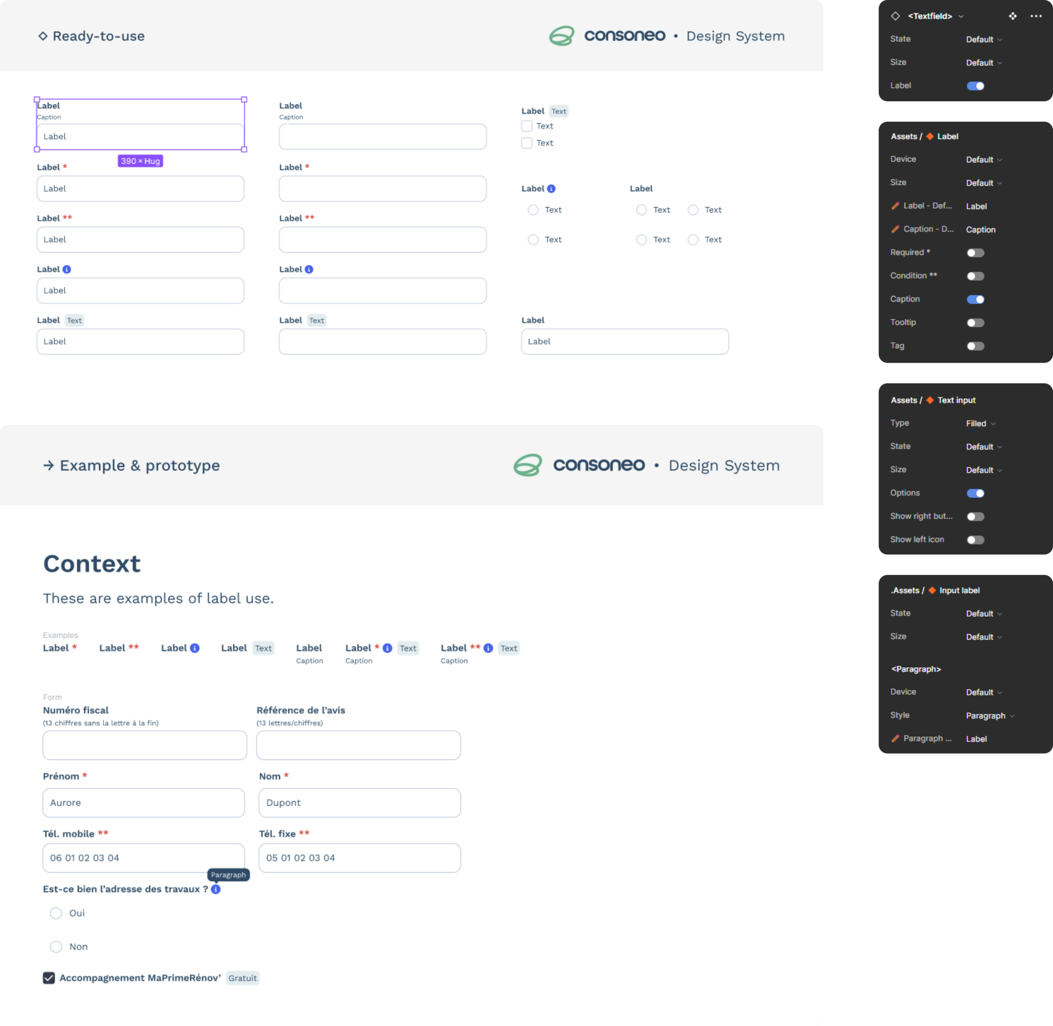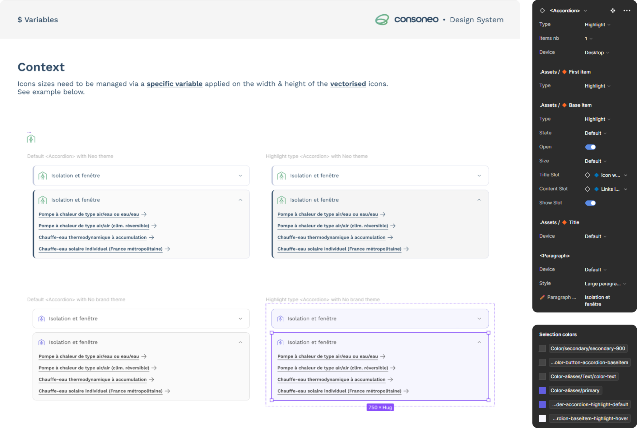 Les composants les plus complexes comprennent toutes les propriétés qui leurs sont utiles en évitant la multiplication inutile de variants. Les différentes déclinaisons possibles sont ainsi mis en lumière dans la partie dédiée à la contextualisation du composant.