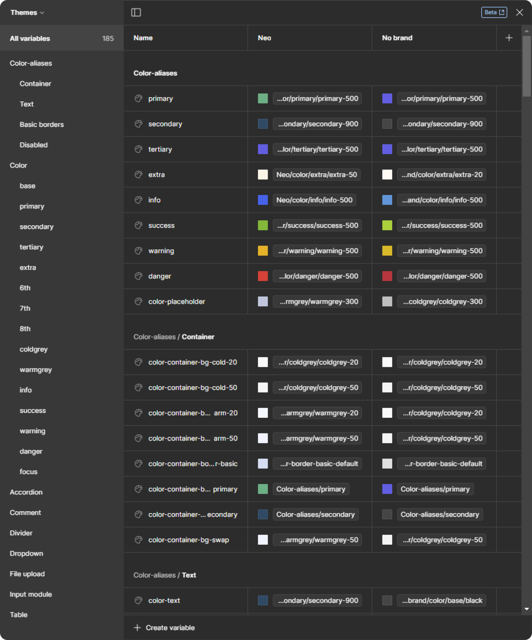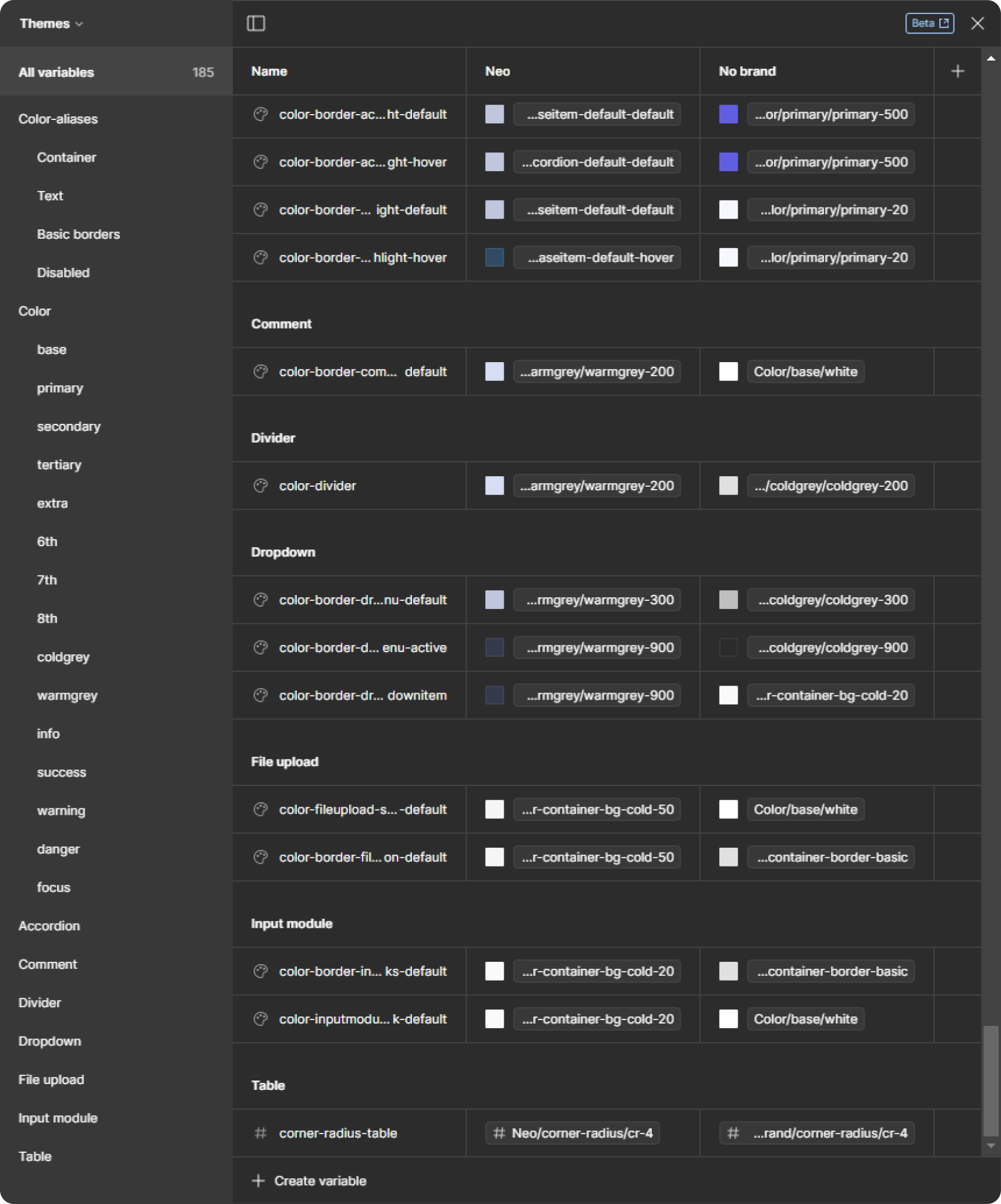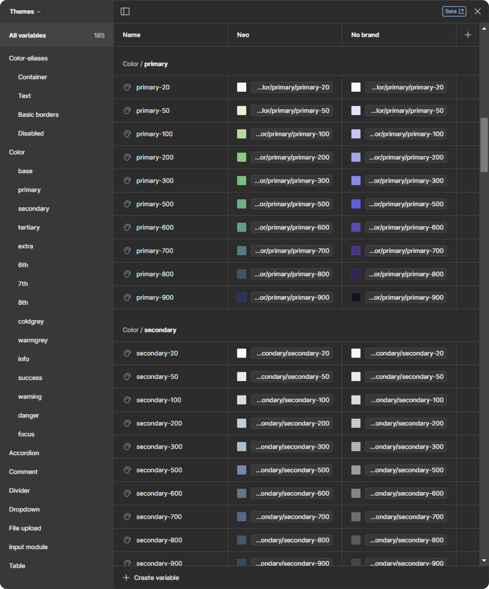 • Avant les récentes mises à jour Figma, un travail de nommage et de classement des variables a été effectué au préalable grâce à Figma Tokens.